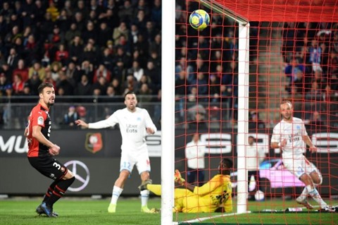 | Le Marseillais Kevin Strootman (2e à gauche) trouve la lucarne sur un ballon relâché par le gardien de Rennes Edouard Mendy, au Roazhon Park, le 10 janvier. |