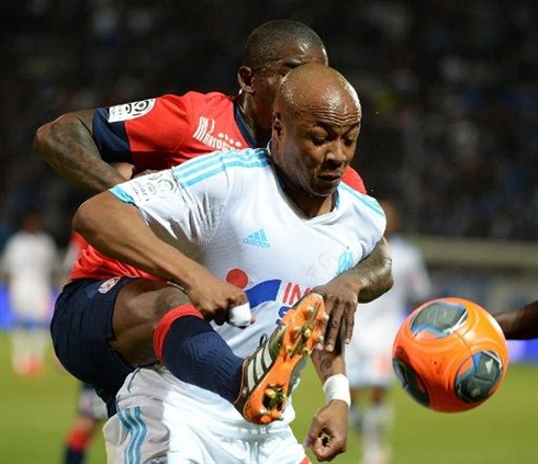 | Marseillais et Lillois se sont neutralisés en Ligue 1 à l'instar de ce duel entre André Ayew (devant) et Rio Mavuba (derrière) au stade Vélodrome, le 20 avril |
