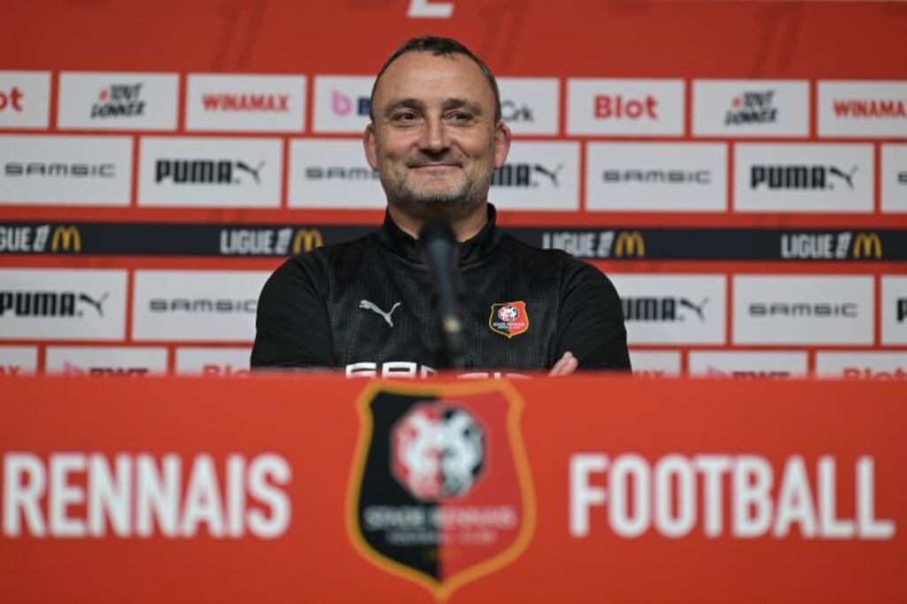 | Franck Haise, le tout nouvel entraîneur de Rennes, s'exprime devant la presse au Roazhon Park, le 18 février. |
