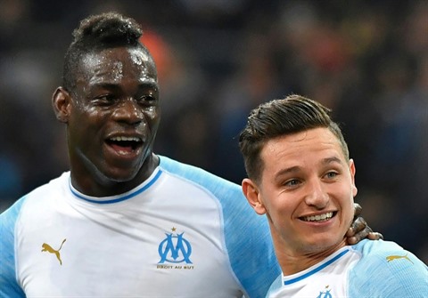 | L'attaquant marseillais Florian Thauvin (droite) congratule son coéquipier Mario Balotelli après son but contre Saint-Etienne en Ligue 1 au Vélodrome, le 3 mars 2019. |