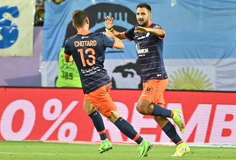 | Gaetan Laborde (droite) après avoir marqué le deuxième but de Montpellier contre Marseille en Ligue 1 le 8 août à La Mosson à Montpellier. |