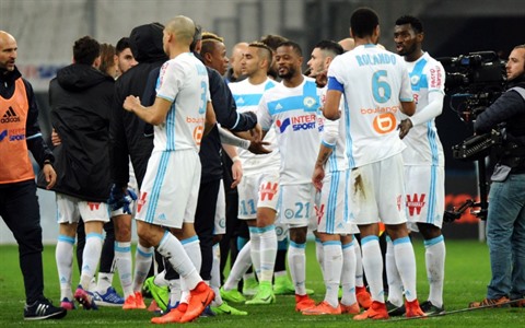 | Le défenseur de Marseille, Patrice Evra (centre), et ses coéquipiers se congratulent après leur victoire face à Rennes au Vélodrome, le 18 février |