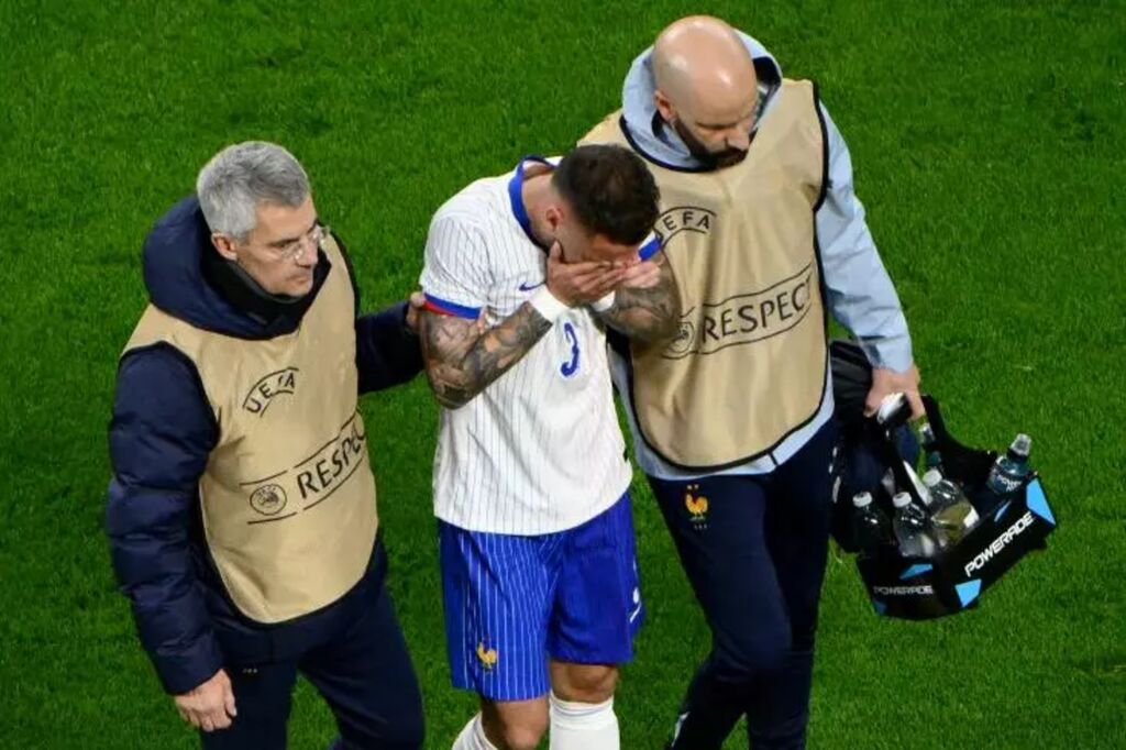 | Le défenseur français Jonathan Clauss quitte le terrain après s'être blessé lors du match amical entre la France et le Chili, à Marseille, le 26 mars. |