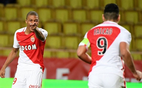 | Le Monégasque Kylian Mbappé (gauche), auteur d'un triplé face à Metz, le 11 février à Louis-II. |