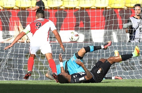 | L'attaquant colombien Radamel Falcao inscrit un but contre Rennes, le 17 septembre 2016 à Louis-II. |