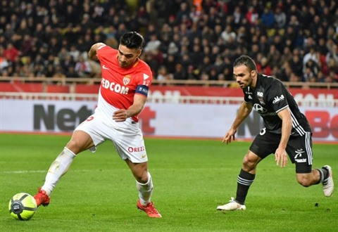 | Le buteur et capitaine colombien de Monaco Radamel Falcao s'apprête à tirer devant le défenseur de Lyon Jérémy Morel, le 4 février au stade Louis-II. |