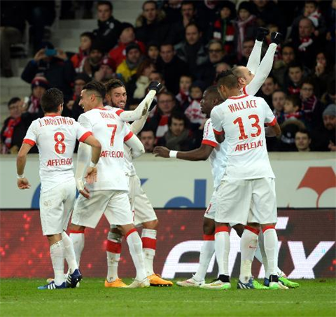 | Les Monégasques fêtent le but de Dimitar Berbatov à Lille, le 24 janvier. |