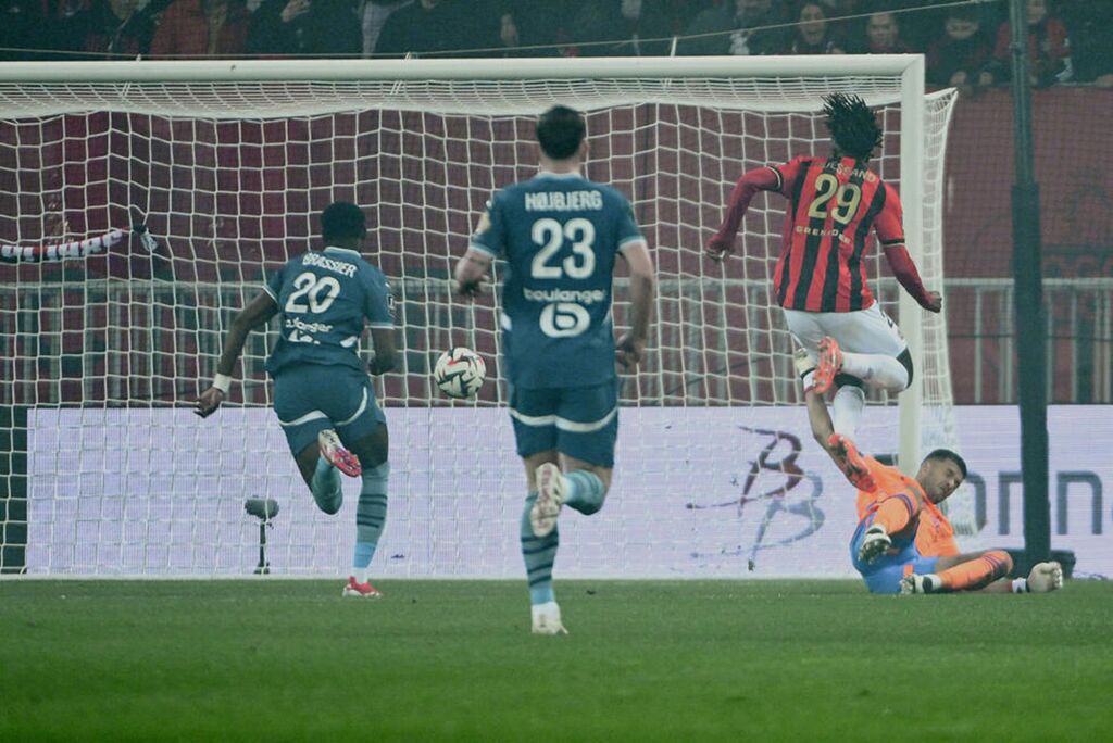 | L'attaquant niçois Evann Guessand ouvre le score d'une jolie pichenette contre Marseille à l'Allianz Riviera, le 26 janvier. |