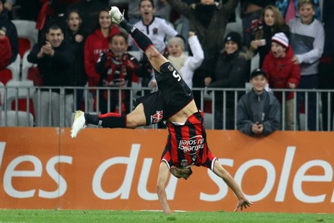 | Le milieu niçois Younès Belhanda fête son but contre Toulouse à l'Allianz Riviera, le 4 décembre |