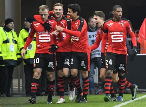 | Les joueurs rennais ont dominé Saint-Etienne avec notamment un but de Kamil Grosicki (g) au Roazhon Park, le 4 décembre. |