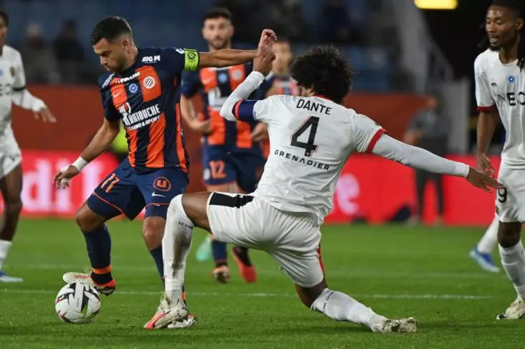 | Le milieu français de Montpellier, Teji Savanier (gauche), au duel avec le défenseur brésilien de Nice, Dante, lors du match nul entre les deux équipes en Ligue 1, au Stade de la Mosson de Montpellier, en France, le 10 novembre 2023. |