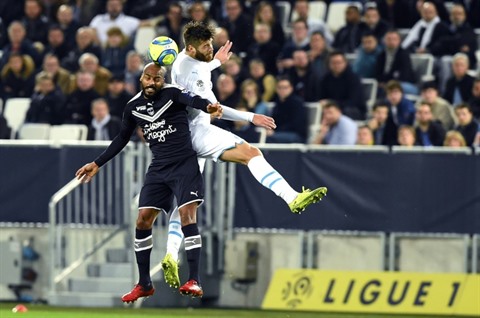 | Duel aérien entre le Marseillais Duje Caleta-Car et l'attaquant de Bordeaux Jimmy Briand lors du match nul entre les deux équipes au Matmut-Atlantique, le 2 février. |