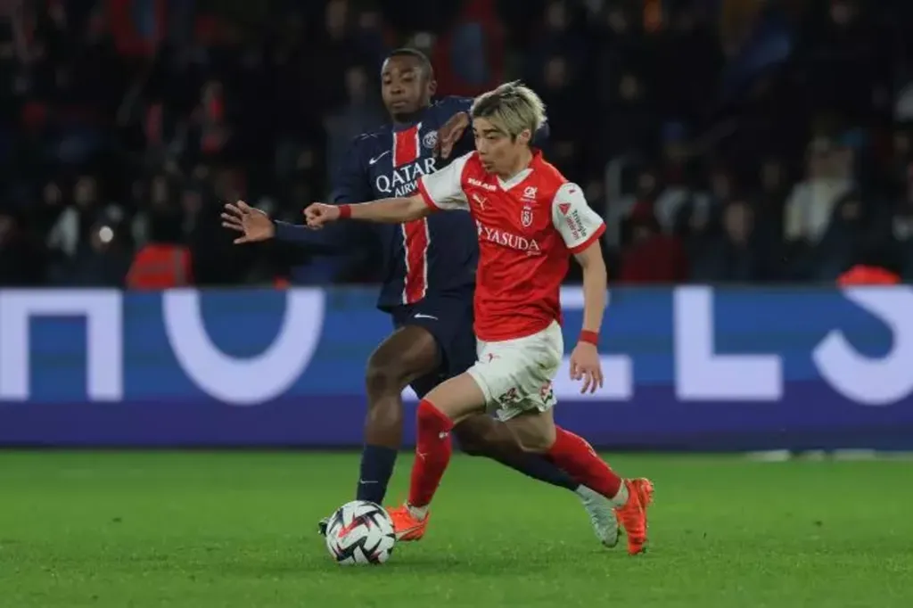 | L'attaquant japonais de Reims Keito Nakamura (droite) lors du match nul arraché devant le Paris Saint-Germain (1-1), le 25 janvier au Parc des Princes. |