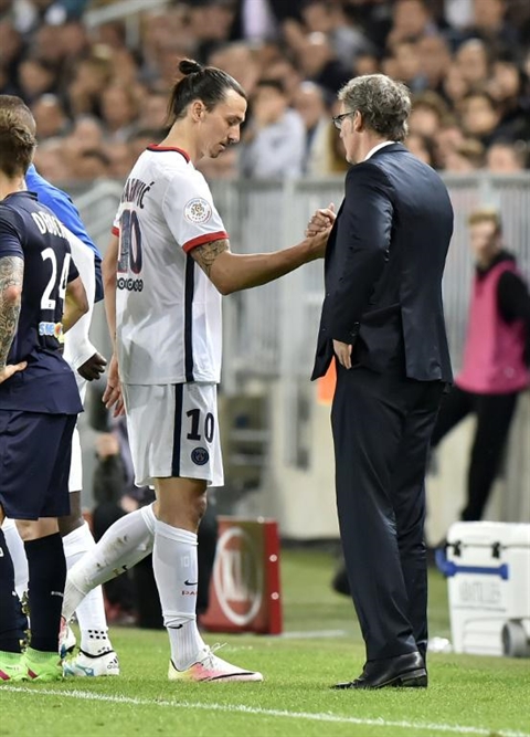 | Zlatan Ibrahimovic (gauche) et l'entraîneur du Paris SG, Laurent Blanc, le 11 mai à Bordeaux. |