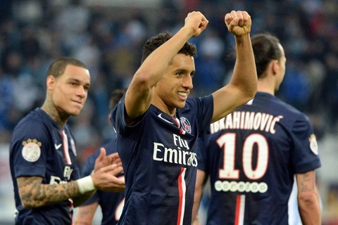 | La joie des Parisiens, dont Marquinhos, après la victoire chez l'OM, le 5 avril au Vélodrome. |