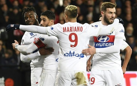 | Les joueurs de Lyon se congratulent après un but de Nabil Fekir, le 17 janvier à Guingamp |
