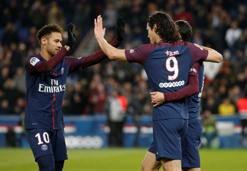 | Paris, porté par le doublé d'Edinson Cavani félicité par Neymar Jr (gauche) également buteur, a dominé Strasbourg au Parc des Princes, le 17 février. |