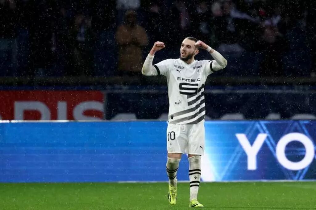 | L'attaquant algérien de Rennes Amine Gouiri célèbre son but contre le Paris Saint-Germain lors du match nul entre les deux équipes en Ligue 1 au Parc des Princes, Paris, le 25 février. |