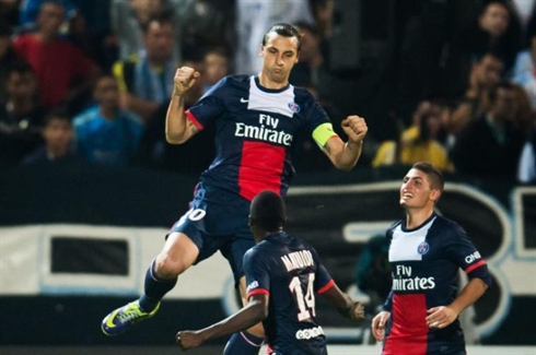 | L'attaquant du PSG, Zlatan Ibrahimovic, fête son but marqué sur penalty contre Marseille, le 6 octobre au Vélodrome |