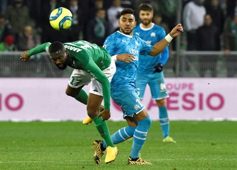 | Le meneur de jeu de Marseille Dimitri Payet (droite) à la lutte avec le Stéphanois Jean-Eudes Aholou, le 5 février à Saint-Étienne. |