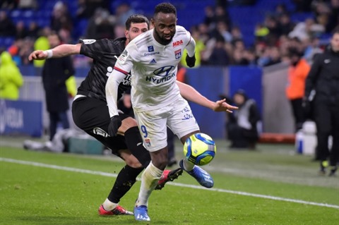 | L'attaquant de Lyon Moussa Dembele devance le défenseur italien d'Amiens Arturo Calabresi, le 5 février 2020 à Décines-Charpieu, près de Lyon. |