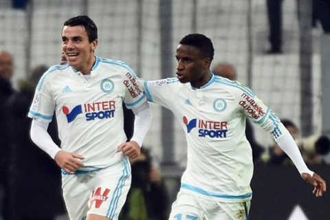 | L'attaquant de l'OM, Antoine Rabillard (gauche), fête son but égalisateur contre Lille, avec son coéquipier Bouna Sarr, le 29 janvier au Vélodrome. |