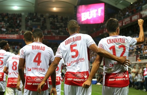 | Les joueurs de Reims vainqueurs de Lyon en ouverture de la 2e journée de L1 le 17 août. |