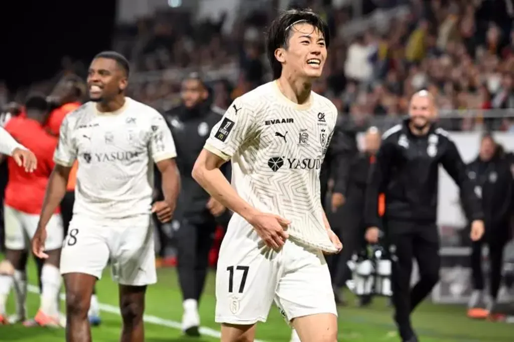 | Le Japonais Keito Nakamura, principal artisan de la victoire de Reims contre Lens à Bollaert, le 11 avril 2025. |