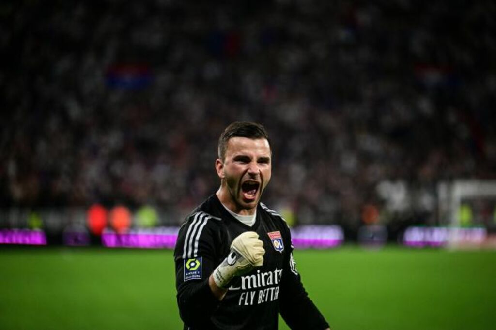 | Le gardien de l'OL, Anthony Lopes, exulte après le succès 4-3 face à Brest, le 14 avril au Groupama Stadium. |