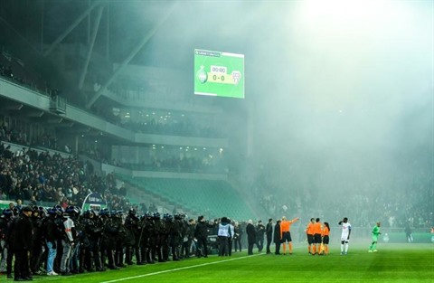 Car le coup d'envoi a d'abord été reporté en raison de dégâts causés sur les filets des buts, rafistolés par les services de la Métropole, propriétaire du stade Geoffroy-Guichard, alors que plusieurs ultras étaient entrés sur la pelouse et avaient envoyés fusées et autres fumigènes au moment de l'entrée des joueurs.