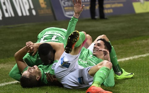 | La joie des joueurs de Saint-Étienne après le but de Romain Hamouma face à Lyon, le 5 février à Geoffroy Guichard. |