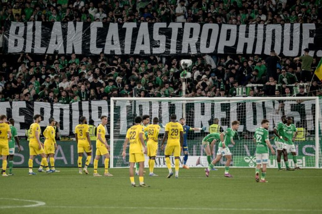 | Une banderole fustigeant le "bilan catastrophique" de Saint-Etienne, relégué en Ligue 2 après sa défaite à domicile face à Toulouse, le 17 mai. |
