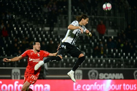 | Le défenseur angevin Mateo Pavlovic (droite) domine l'attaquant caennais Enzo Crivelli, lors du dernier match disputé à Angers, le 1er décembre. |