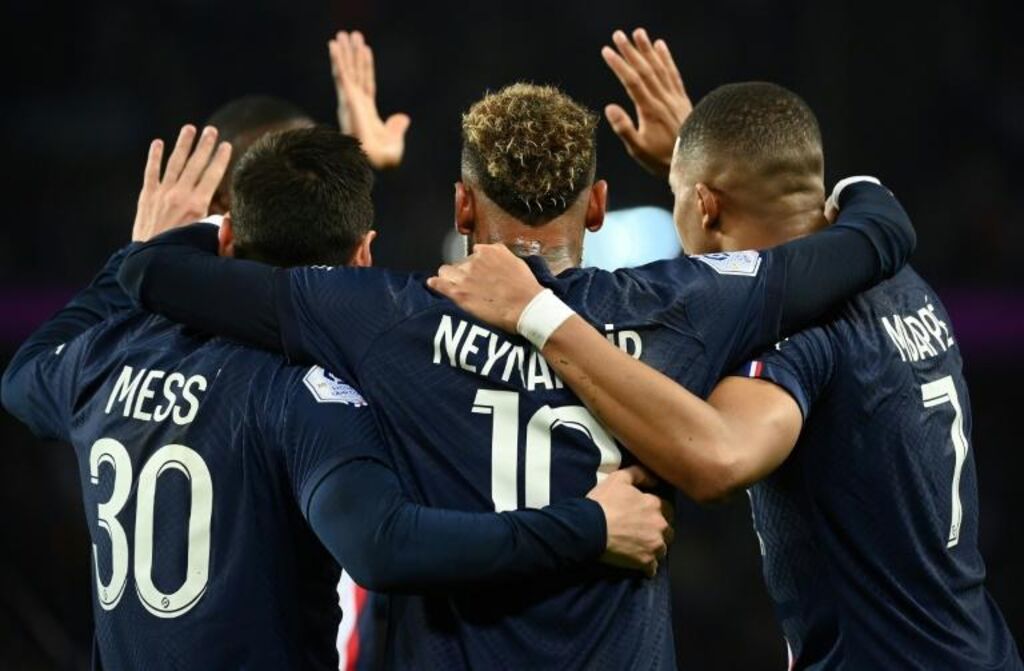 | Messi, Neymar et Mbappé célèbrent le but du PSG contre l'OM, le 16 octobre 2022 au Parc des Princes. |