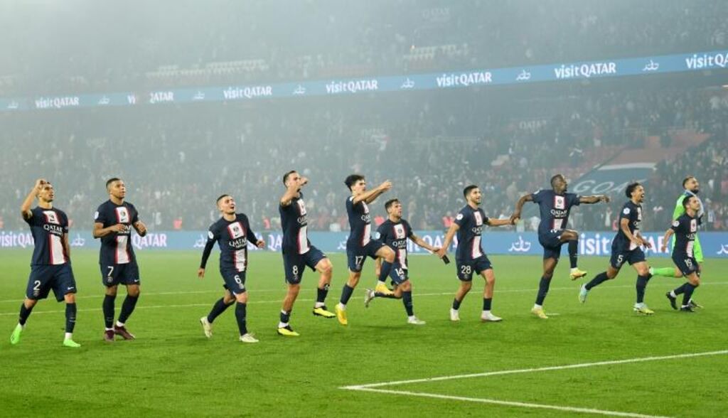 | Le PSG célèbre sa victoire contre l'OM, le 16 octobre 2022 au Parc des Princes. |