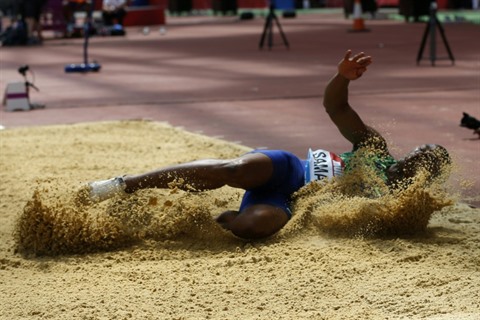 | Le Sud-africain Ruswahl Samaai lors du concours de la longueur du meeting Ligue de diamant de Londres, le 20 juillet 2019. |