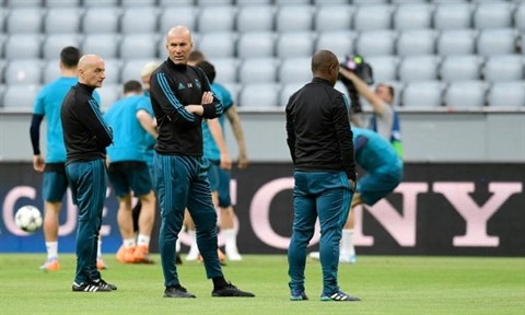 | Zinédine Zidane et son staff supervisent l'entraînement du Real Madrid à l'Allianz Arena, le 24 avril pour le match contre le Bayern Munich. |