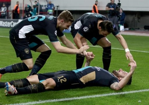 | La joie de l'attaquant d'Arsenal, Olivier Giroud, auteur d'un triplé contre l'Olympiakos, le 9 décembre au Pirée. |