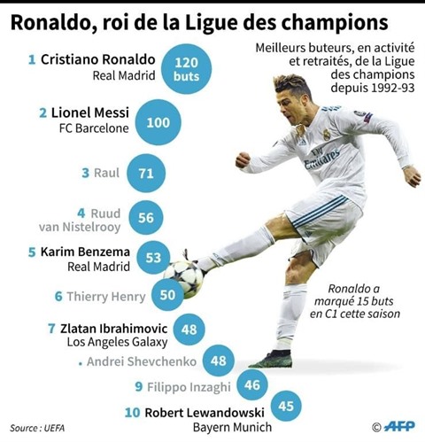 Les chiffres, évidemment, parlent d'eux-mêmes: En C1, Ronaldo a placé ses records à des niveaux quasi inaccessibles: 120 buts en 150 matches, dont déjà 15 cette saison, à deux longueurs de son record de 2013/14 (17). Il a marqué au moins un but lors de ses 11 derniers matches dans la compétition. Contre le Bayern Munich, le Portugais a fait mouche 9 fois en trois confrontations européennes, dont 5 fois la saison dernière en quart de finale (doublé à l'aller à Munich et triplé au retour à Madrid).
