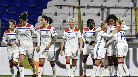 | Wendie Renard (droite) félicitée par ses coéquipières après son but pour Lyon face à Wolfsbourg, en Ligue des champions, le 20 mars. |