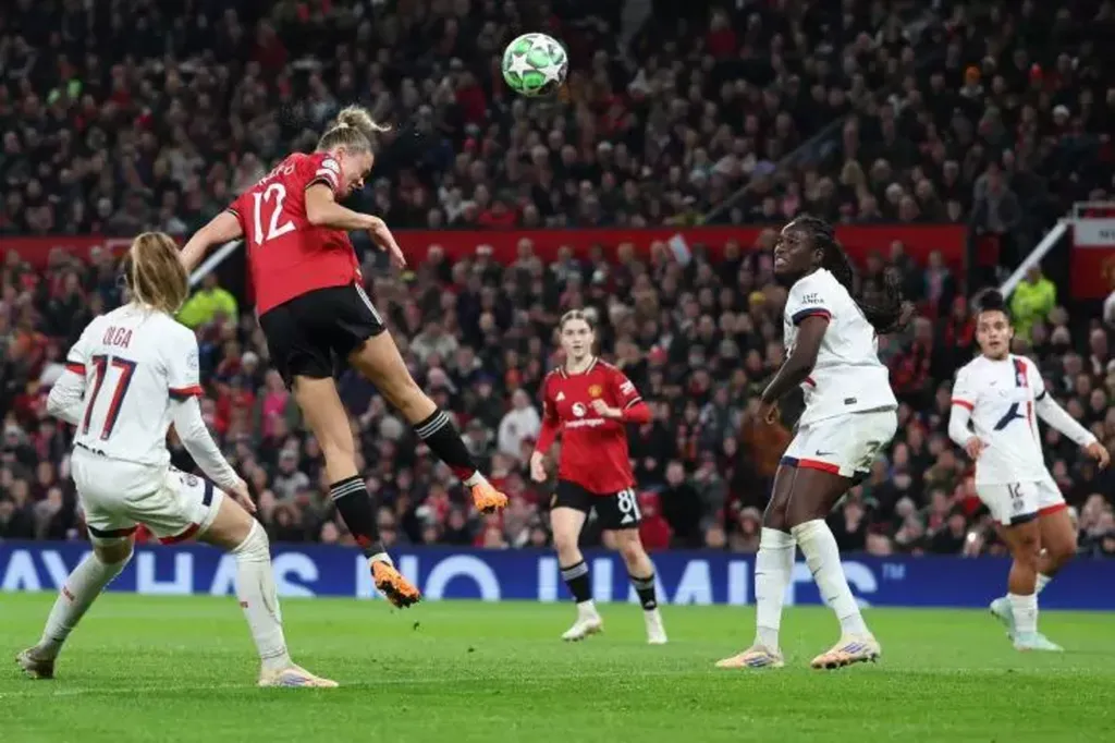 | La milieu suédoise de Manchester United Fridolina Rolfo marque de la tête le deuxième but de son équipe contre le PSG mercredi 12 novembre en Ligue des champions à Old Trafford. |