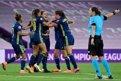 | La meneuse de jeu lyonnaise Amel Majri est félicitée par ses coéquipières, après son but marqué contre le Bayern Munich, lors du quart de finale de la Ligue des champions, le 22 août 2020 au Stade San Mamés à Bilbao. |