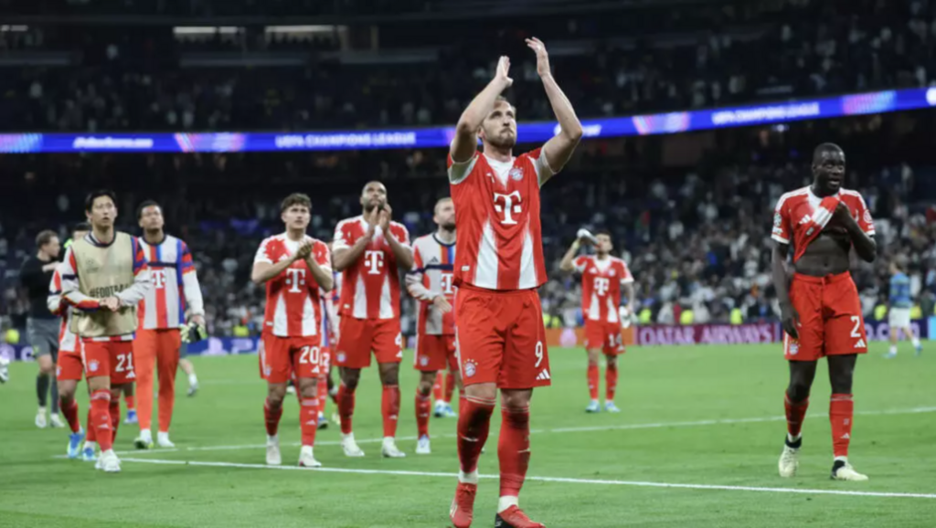 | Les joueurs du Bayern Munich, Harry Kane en tête, communient avec leurs supporters à l'issue de leur victoire contre le Real Madrid au stade Santiago-Bernabeu, le 7 avril. |