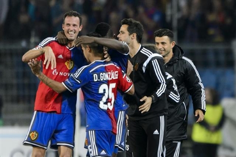 | L'équipe du FC Bâle, lors d'un match de Ligue des champions contre Liverpool, le 1er octobre 2014 à Saint. |