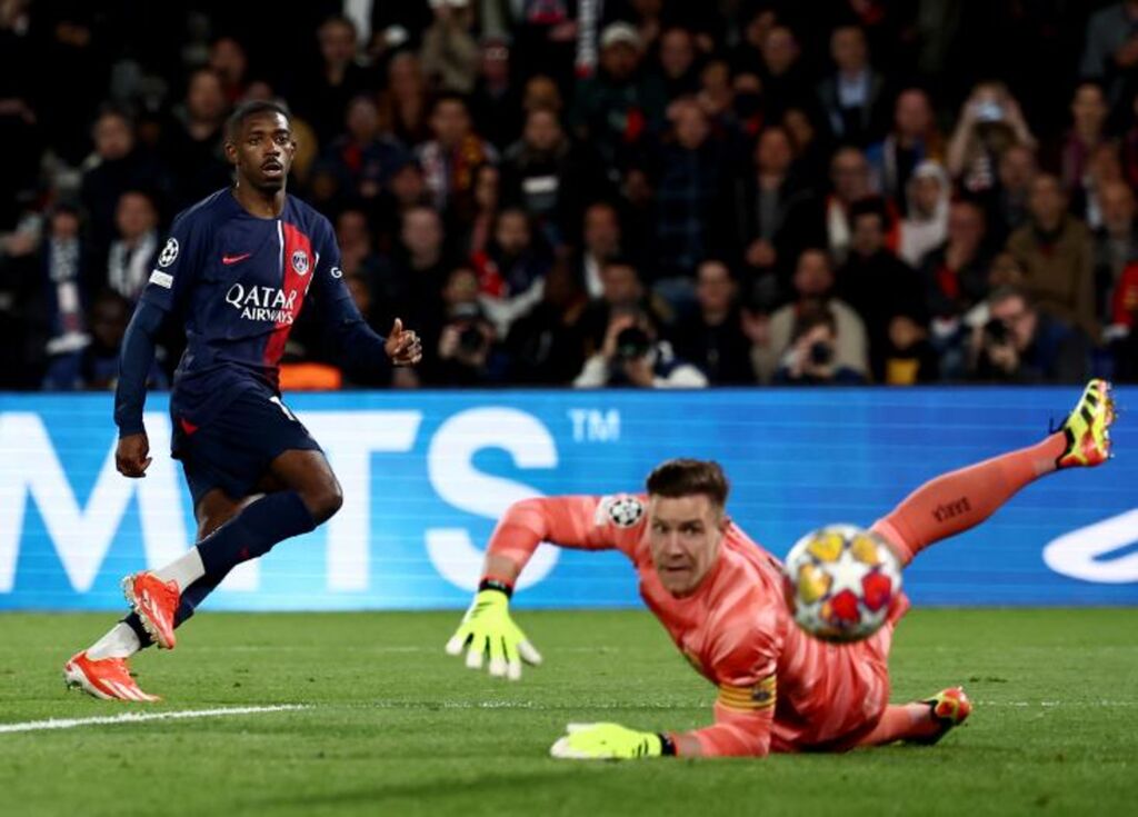 | L'attaquant du PSG, Ousmane Dembele, devant le gardien du FC Barcelone, Ter Stegen, en quart de finale aller de Ligue des champions, le 10 avril au Parc des Princes à Paris. |