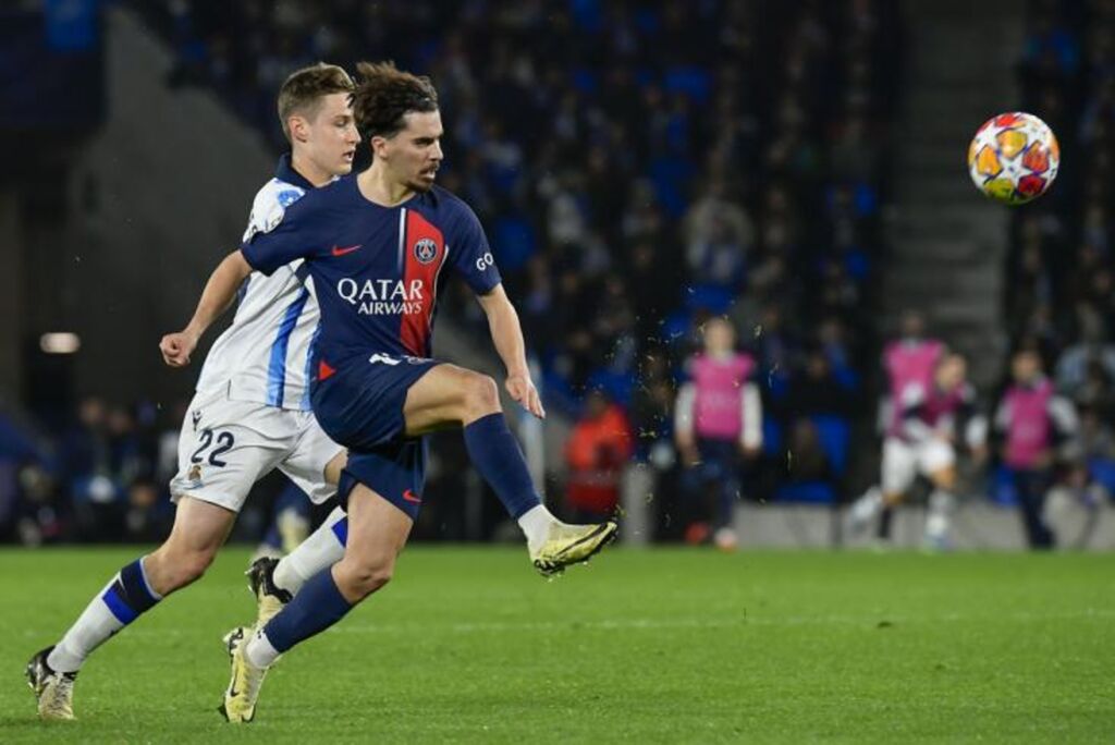 | Le joueur du PSG Vitinha en duel avec le joueur du Real Sociedad Benat Turrientes lors d'un match de la Ligue des Champions au stade Reala Arena à San Sebastian, le 5 mars. |