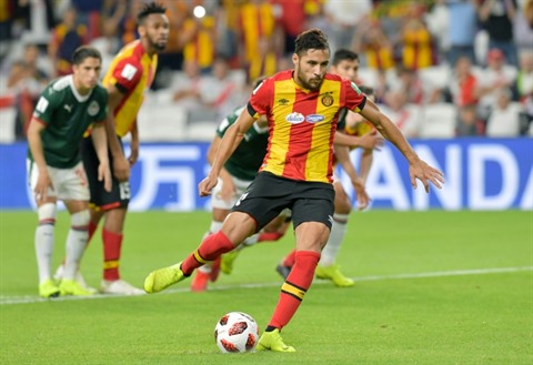 | L'attaquant Mohammed Youcef Belaili transforme un penalty pour l'ES Tunis contre Guadalajara à Abou Dhabi, le 18 décembre 2018. |