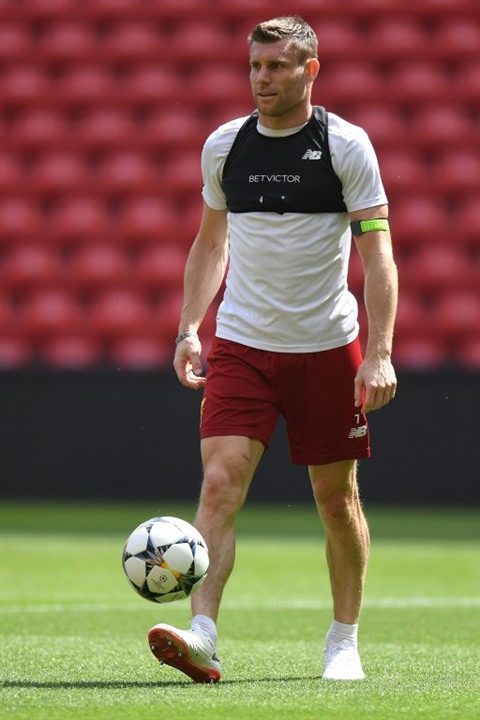 | Le milieu anglais de Liverpool James Milner lors d'une séance d'entraînement de son équipe à Anfield, le 21 mai. |