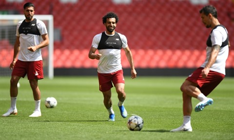 | Mohamed Salah (centre) défie Dejan Lovren, sous le regard d'Emre Can (gauche), lors d'une séance d'entraînement de Liverpool à Anfield, le 21 mai. |