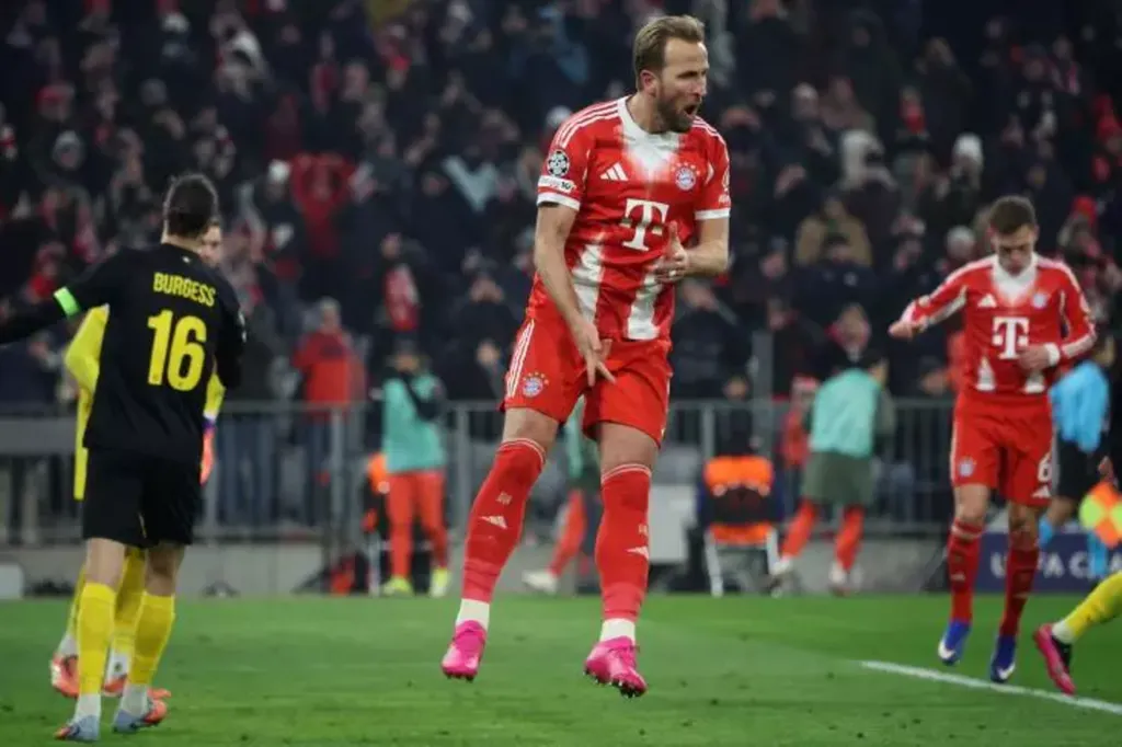 | L'attaquant anglais du Bayern Munich, Harry Kane, exulte après avoir marqué lors de la victoire du Bayern contre l'Union St-Gilloise en Ligue des champions, le 21 janvier à Munich (Allemagne). |